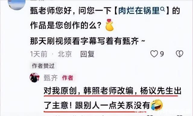 有网友向甄皆求证,甄皆恢复说:“我原创,韩照(即韩兆)本分改编,杨议先生出了倡导!跟别东谈主小数干系莫得。”